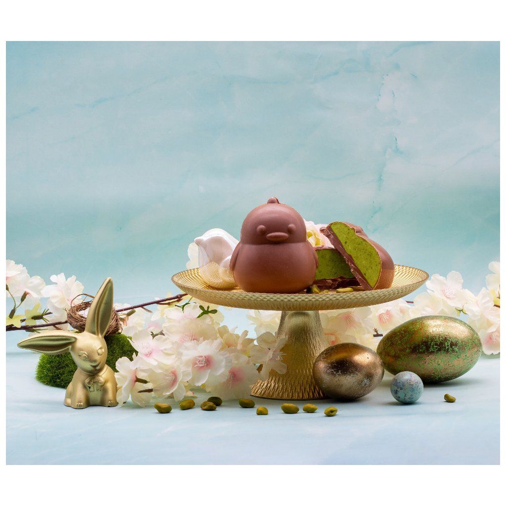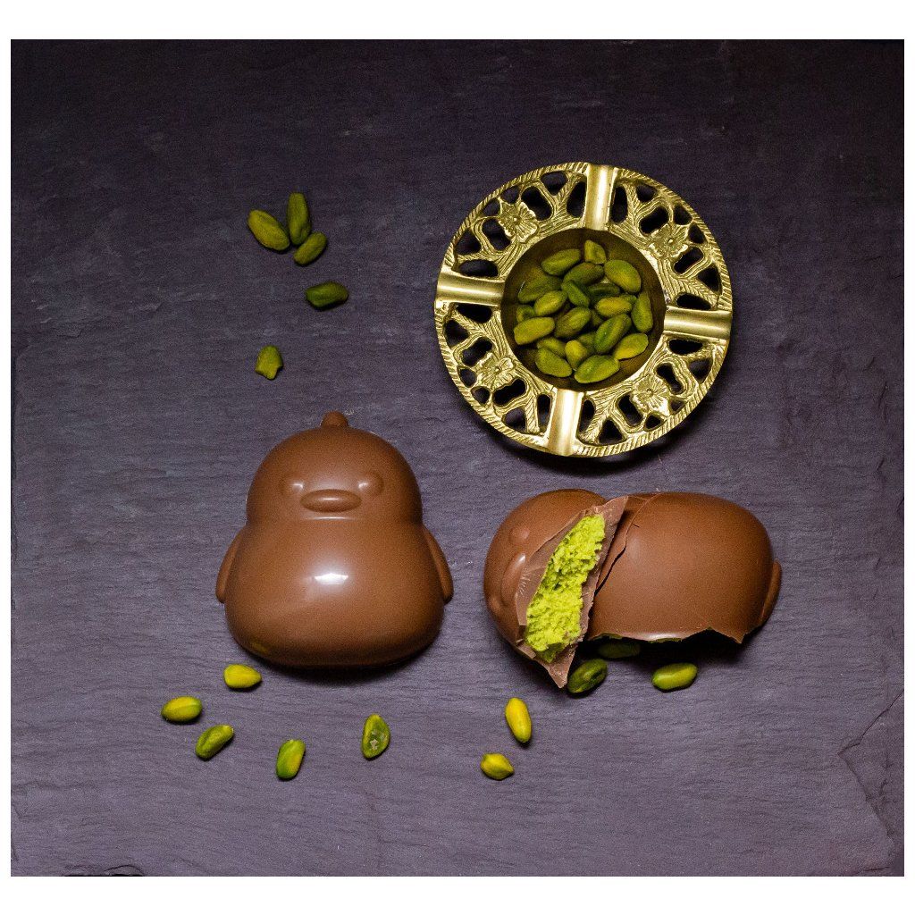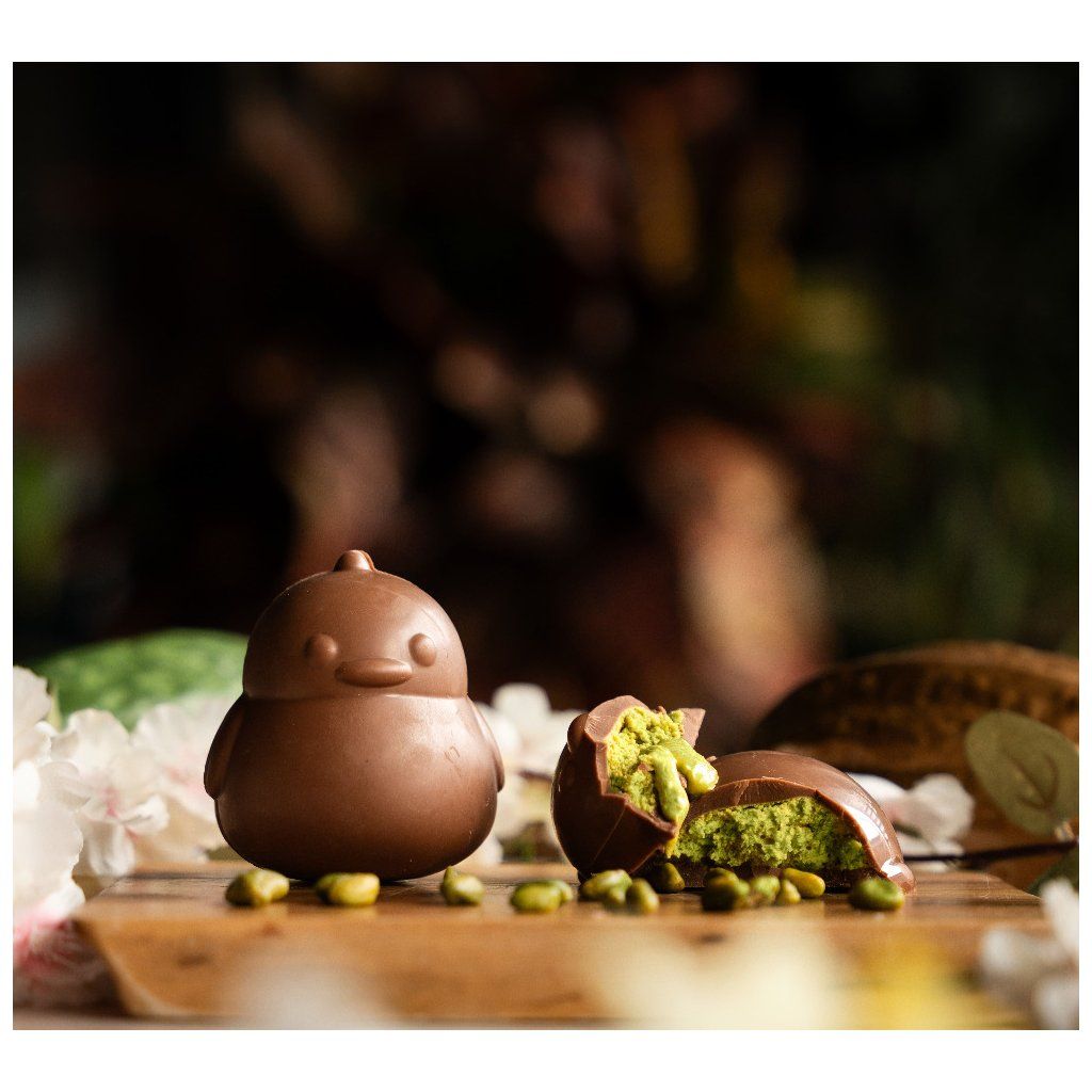 Máme pro vás novinku! Roztomilé čokoládové kuřátko z jemné mléčné čokolády ukrývá lahodný krém z pistácií a bílé čokolády. Radost v každém soustu – ideální dárek do velikonočního košíčku!
