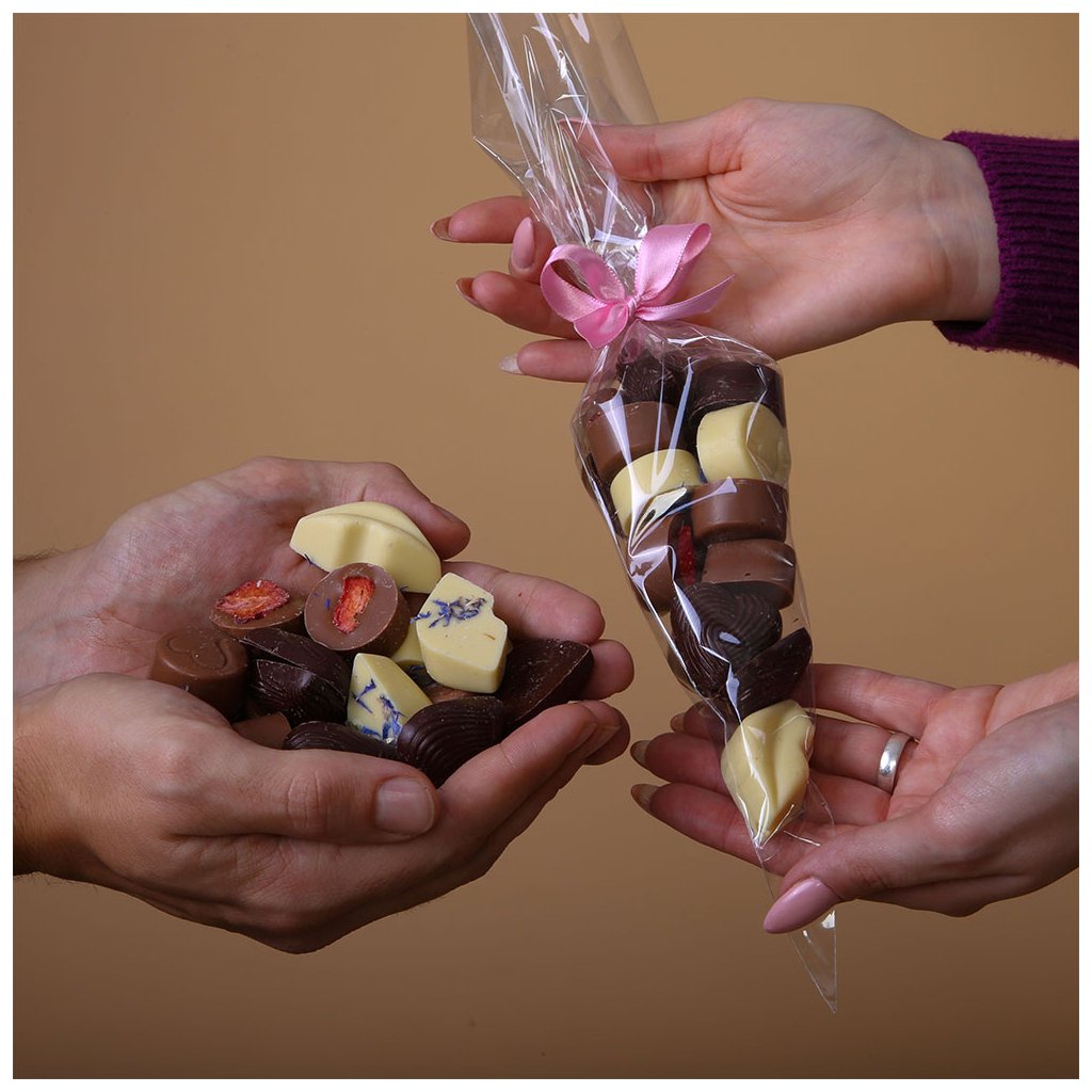 Roztomilá čokoládová drobnost, kterou potěšíte každého milovníka kvalitní čokolády. Z nejhezčích formiček jsme Vám odlili z našich prémiových čokolád plný kornout zamilovaných motivů. Tvarů i čokoládových chutí je na výběr a užijete si s nimi jistě krásné chvilky.