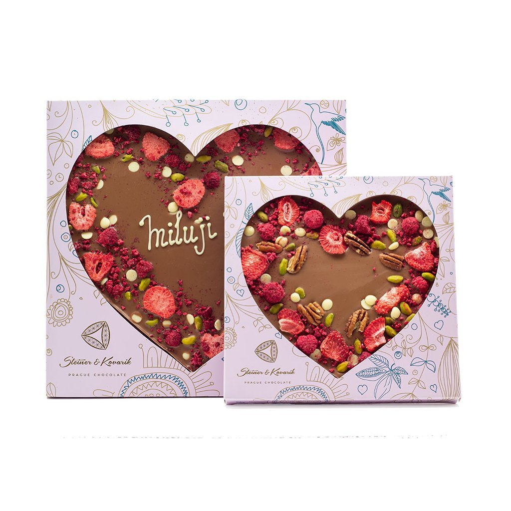 mléčná čokoláda: obsah kakaové sušiny min. 35 % (cukr, kakaové máslo, sušené mléko, kakaové boby, emulgátor: slunečnicový lecitin, aroma: přírodní vanilka), bílá čokoláda: obsah kakaové sušiny nejméně 28 % (cukr, kakaové máslo, sušené plnotučné mléko, emulgátor: sójový lecitin, aroma: přírodní vanilka), pistácie, pekanové ořechy, lyofilizované jahody, lyofilizované maliny. Uchovávejte v chladu a suchu. Vyrobeno ručně v České republice.
