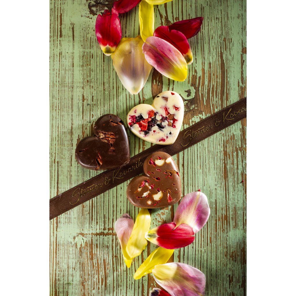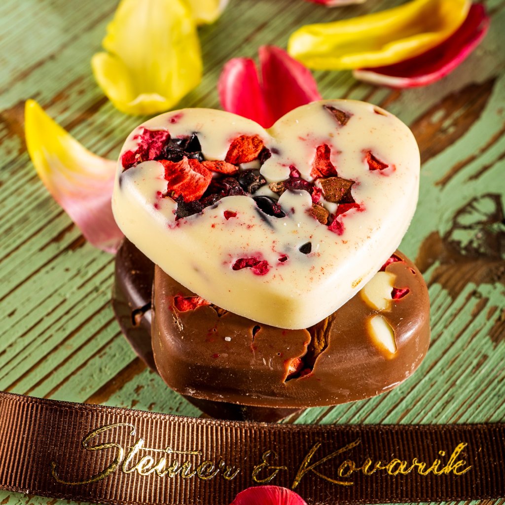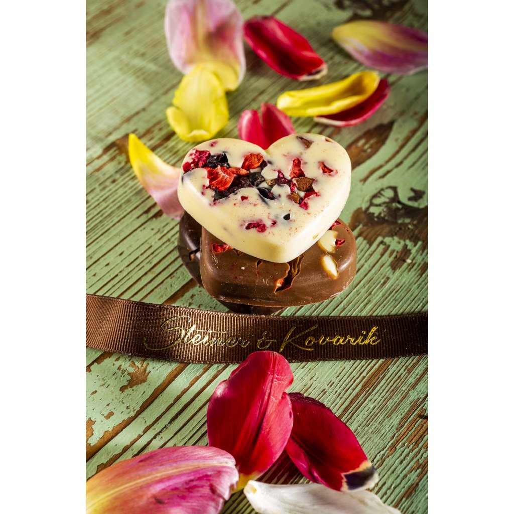 Novinkou našeho sortimentu je roztomilé malé srdce z populární velmi kvalitní bílé čokolády Steiner & Kovařík do které jsou zalité lyofilizované jahody, maliny a rybíz. Vytváří tak jedinečný atraktivní a moderní design, který jako dárek rozhodně potěší každého. Jakmile jej ochutná, zcela mu propadne, sladkost a krémovost bílé čokolády a lehká kyselost lyofilizovaného ovoce vytváří hravou a veselou kombinaci chutí.