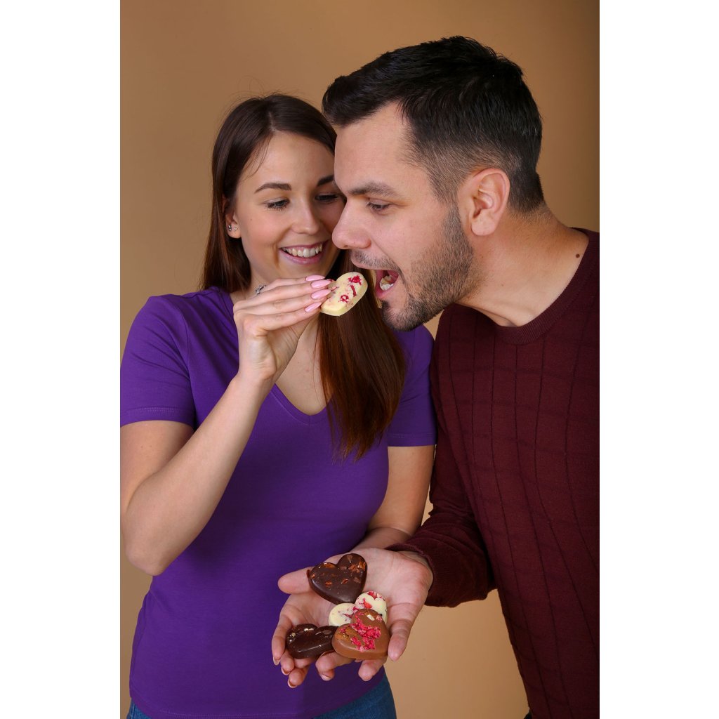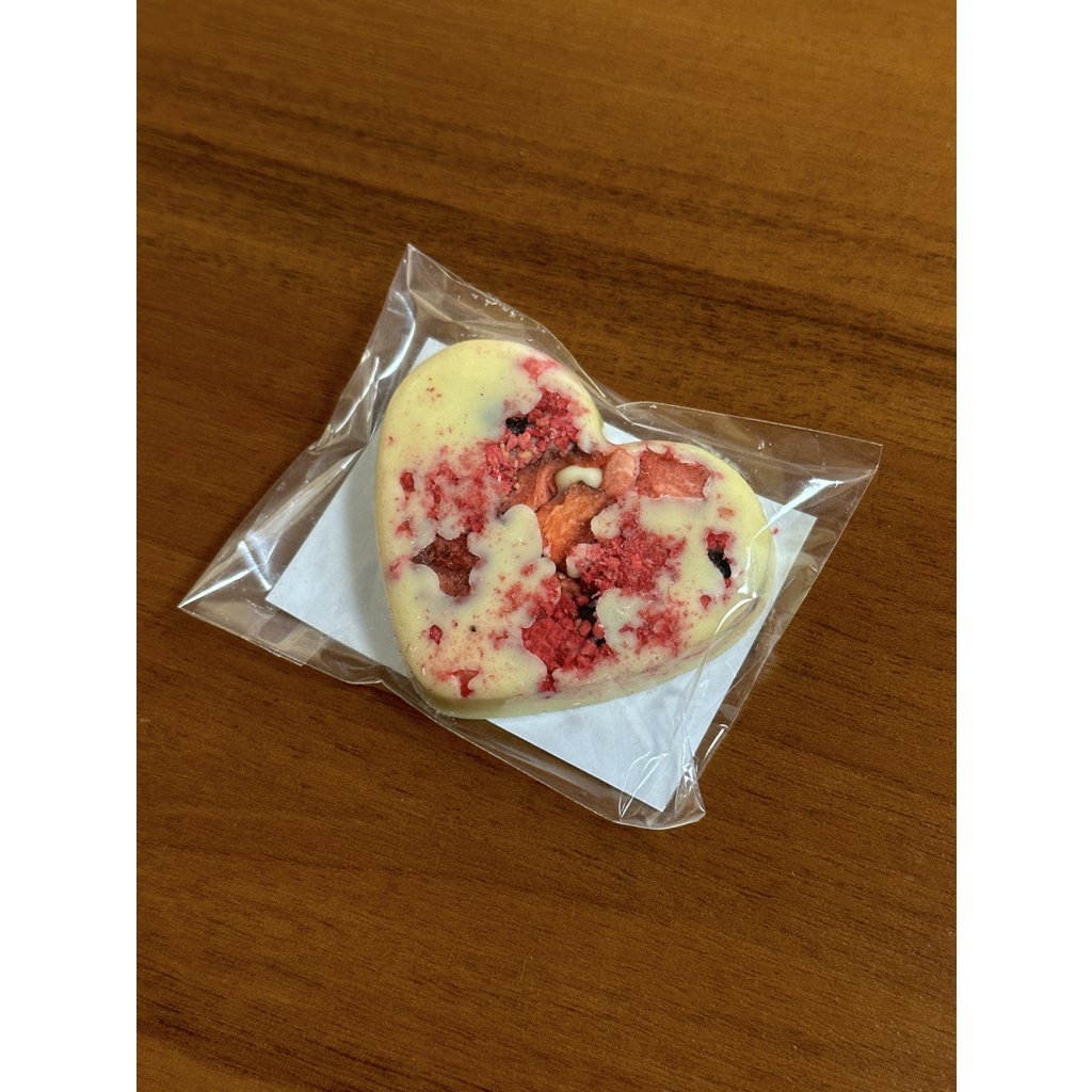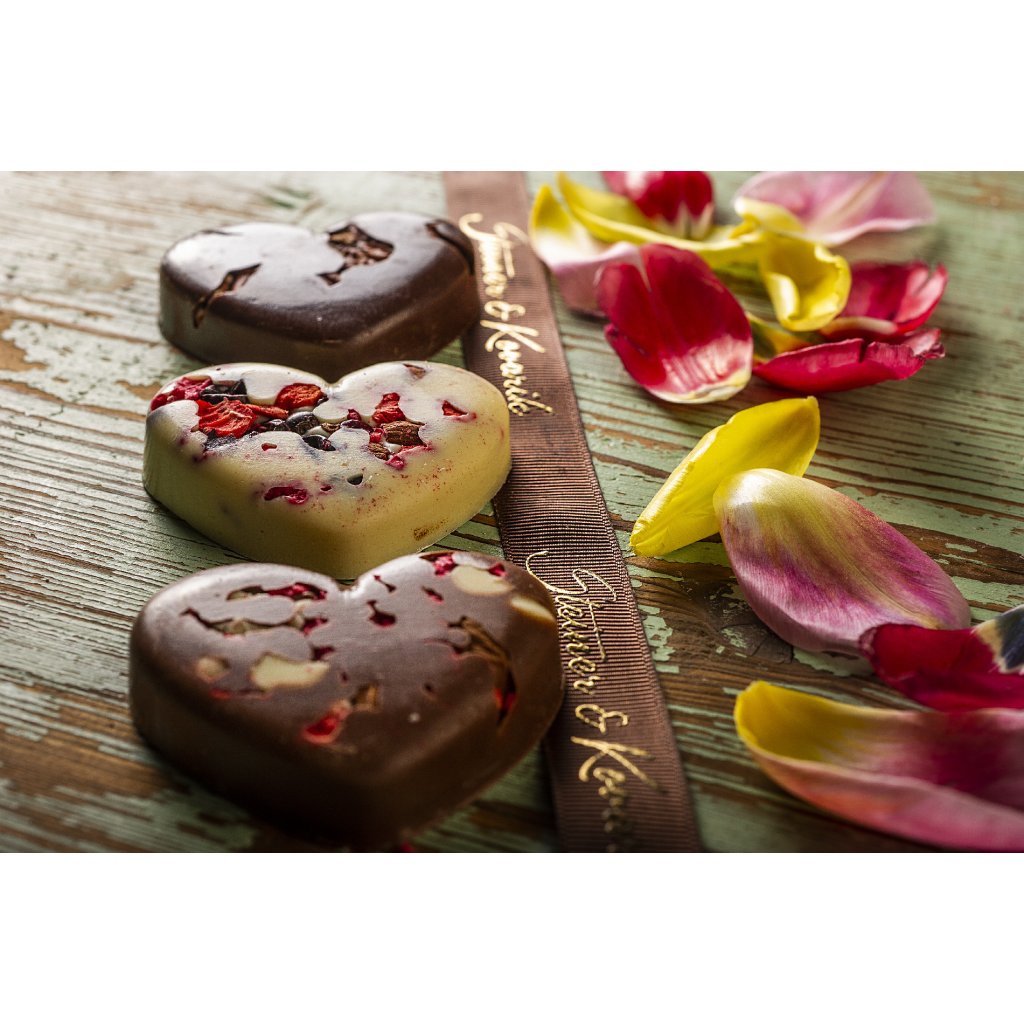 Novinkou našeho sortimentu je roztomilé malé srdce z populární velmi kvalitní bílé čokolády Steiner & Kovařík do které jsou zalité lyofilizované jahody, maliny a rybíz. Vytváří tak jedinečný atraktivní a moderní design, který jako dárek rozhodně potěší každého. Jakmile jej ochutná, zcela mu propadne, sladkost a krémovost bílé čokolády a lehká kyselost lyofilizovaného ovoce vytváří hravou a veselou kombinaci chutí.