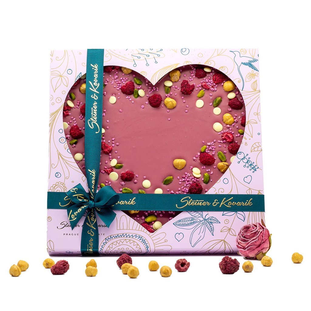 Ruby čokoláda svěží a nová chuť, tvoří základ pro toto půlkilové srdce. Provoní Vám interiér, naladí Vaše smysly a na jazyku se jen rozplývá. Vytvořit z ní velký symbol lásky byla snadná volba a spojením s lyofilizovaným posypem, dotvořilo romantické vyznání.