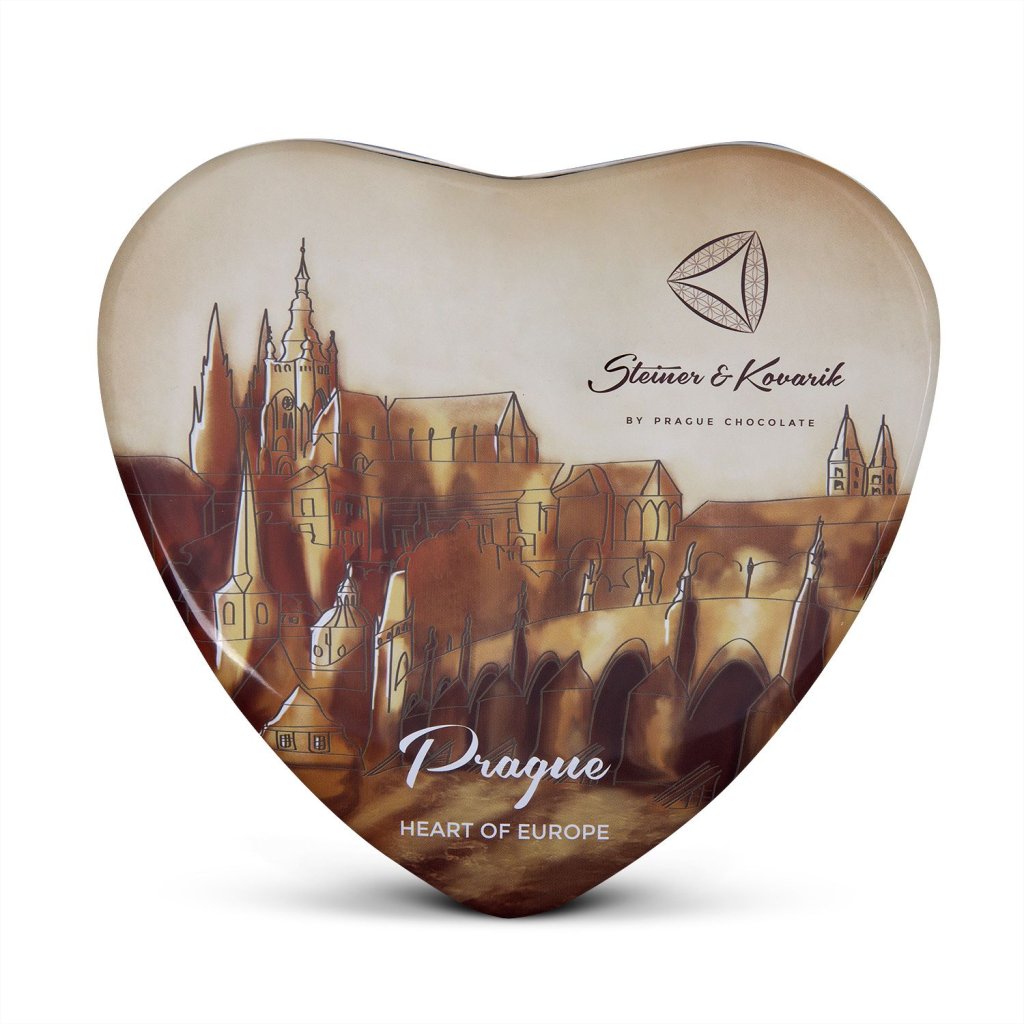 Srdce plné lahodných, ručně vyráběných pralinek z klasických českých ingrediencí a výběrové čokolády Steiner & Kovarik. V krásné plechové dóze ve tvaru srdce na vás čeká pět druhů lahodných ručně dělaných pralinek - švestky macerované v Tuzemáku v mléčné čokoládě, nugát z piemontských oříšků v hořké čokoládě, pistáciový marcipán v mléčné čokoládě, mangová náplň v hořké čokoládě a malinová náplň v mléčné čokoládě.