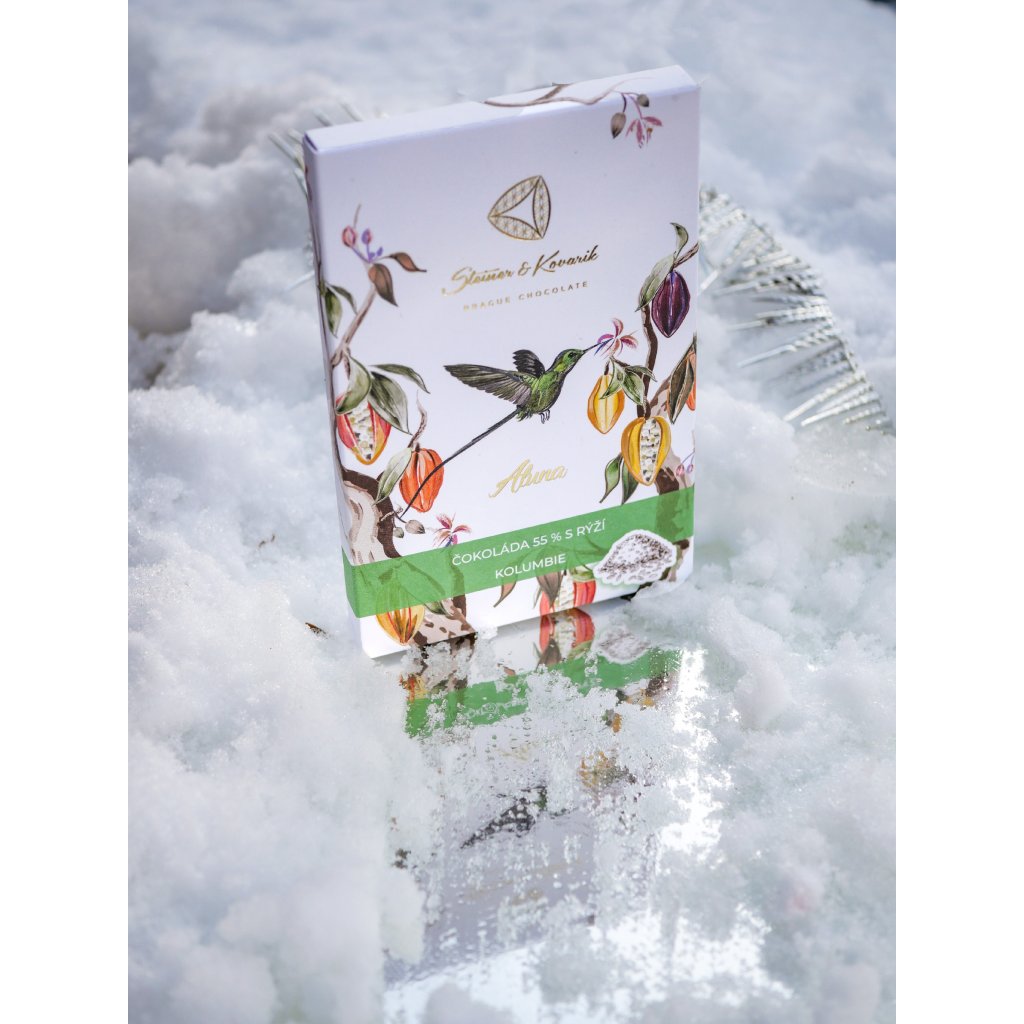 Kakaové máslo, kokosový cukr, kakaové boby, rýže 10 %. Obsah kakaových součástí nejméně 55 %. Může obsahovat mléko, arašídy a suché skořápkové plody. Uchovávejte v chladu a suchu. Produkt kontrolovaného zemědělství. Vyrobeno ručně v České republice.