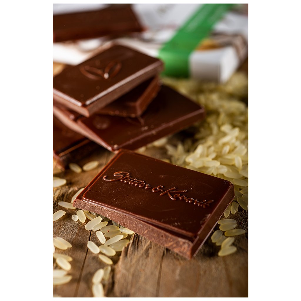 Udržitelnost planety je pro nás velmi důležité téma a proto hledáme nové cesty i v čokoládovém světě. U této 55% čokolády jsme odstoupili od klasického živočišného mléka a 100% jsme ho nahradili rýží, je tak mnohem přátelštější k přírodě i našemu tělu. Je vhodná i pro vegany.